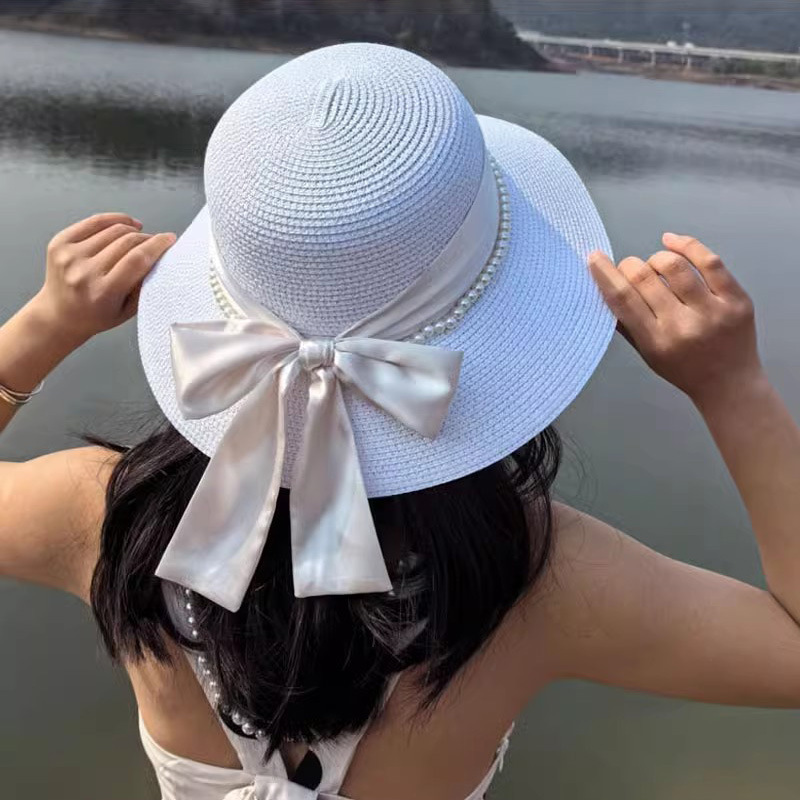Summer Hepburn-style bow-tie beach straw hat for women, sun protection, versatile fisherman's hat, perfect for outings and UV protection.