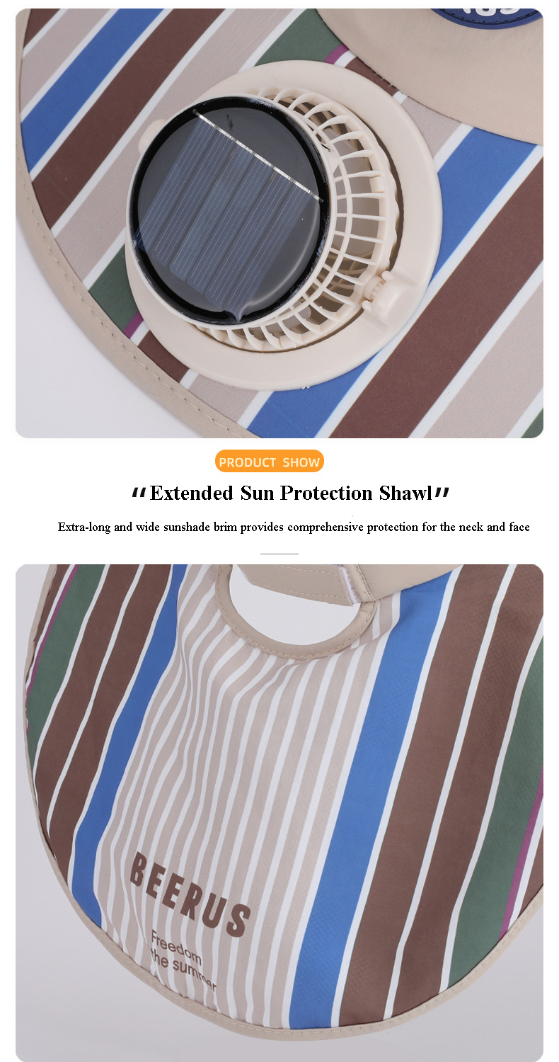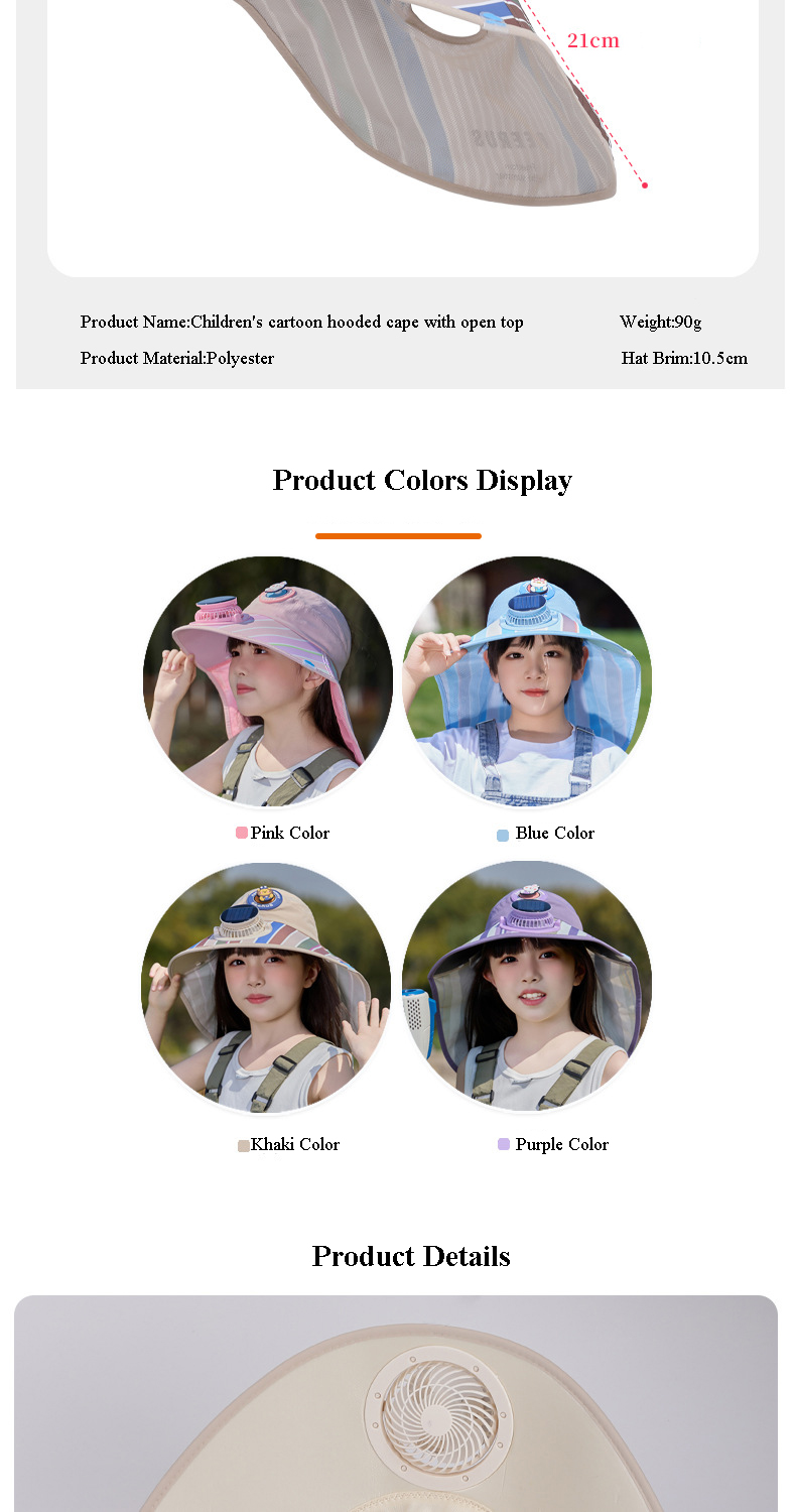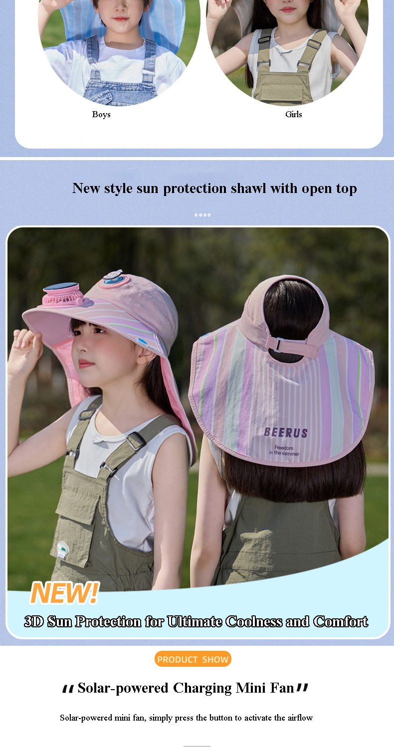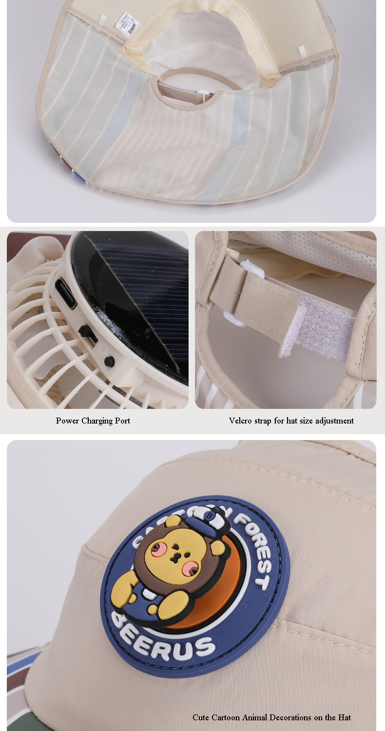 Built-in Solar Fan & Rechargeable:The unique solar fan hat technology powers the airflow around the head, allowing children to no longer have sweaty hair to complain about!The detachable energy-saving solar panel powers the quiet fan (no battery required!)It also supports USB charging and can be used on cloudy days.
