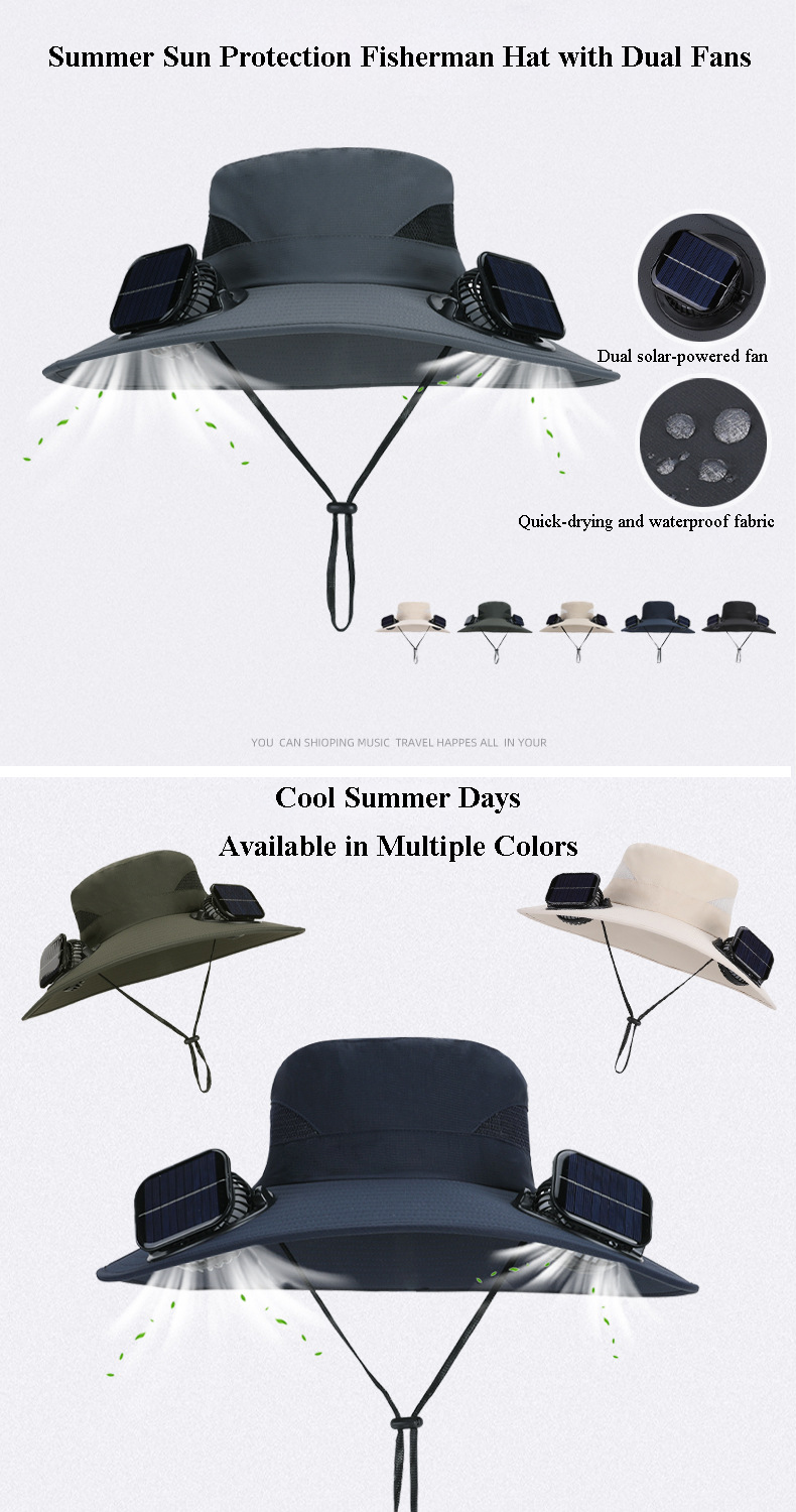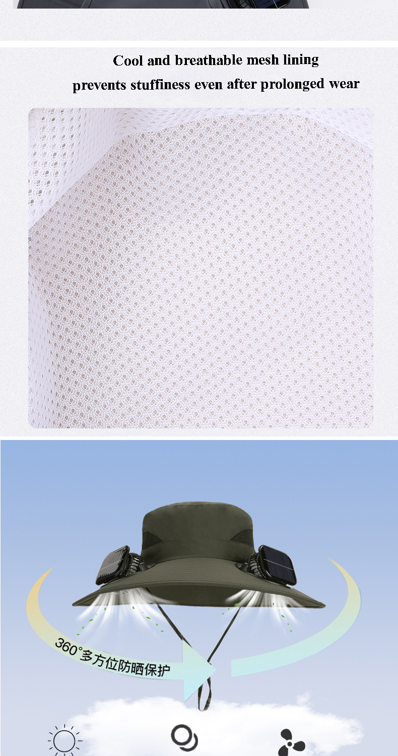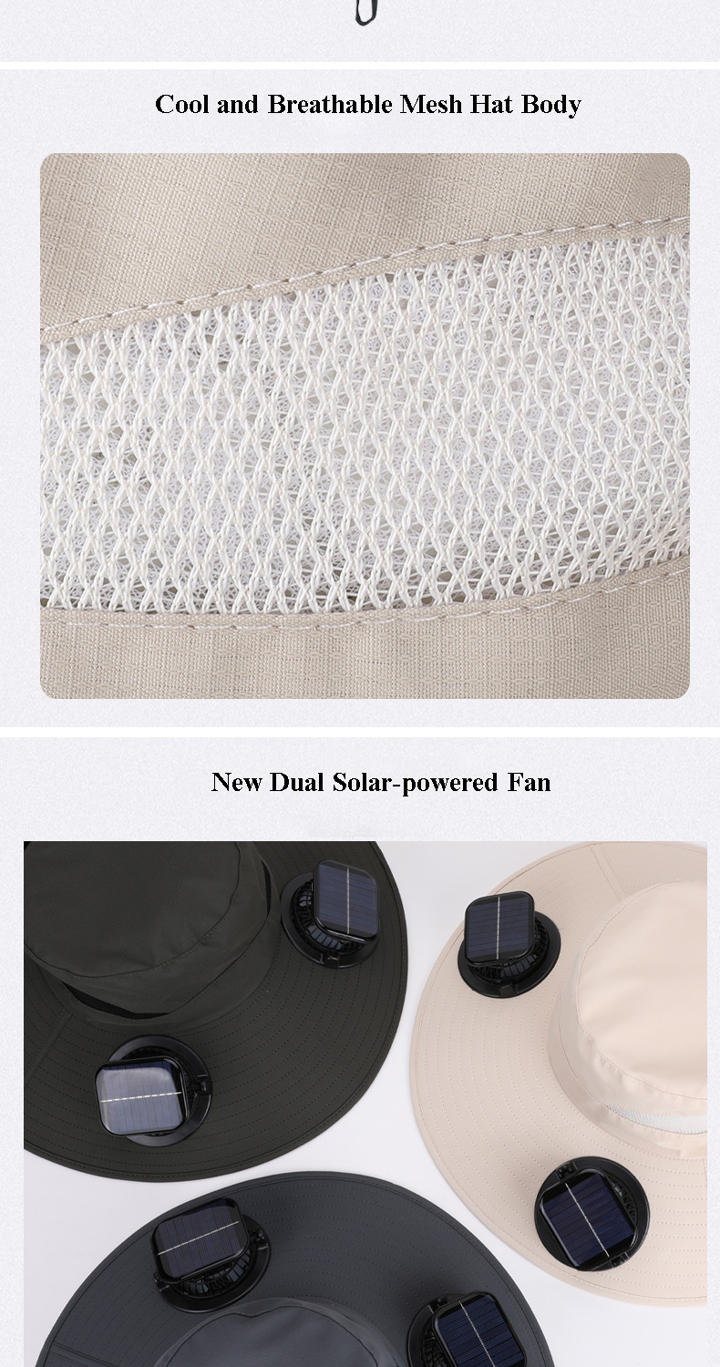 【Sun-proof】: Solar fan fishing hat is wide brim, 5 inches wide brim provides ample protection for your face and neck of sunshade. Large-area hat shielding combined with UPF50+ fabric, effectively blocked direct sunlight. Your face and head stay cool and comfortable while you're gardening, fishing, or just taking a leisurely stroll, without the need for constant adjustments