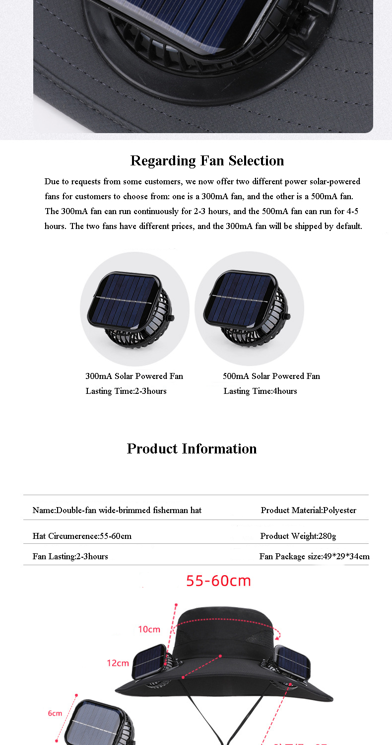 【Wide Brim Hat with Fan】: You will get 1 x wide brim sun hat, which is built-in 2 x solar fans, and 2 x USB cables. You can hang the outdoor fishing sun cap around your head and take it everywhere