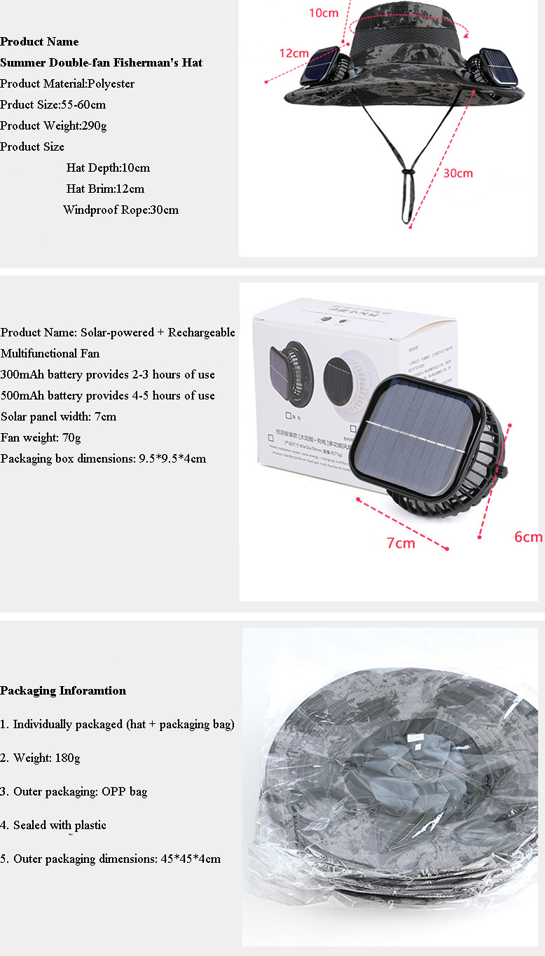 Solar energy+USB energy: Our solar fan hat adopts a dual charging mode: solar energy automatically charges when used outdoors, while the USB-C port can be used for emergency charging through a portable power bank. Never worry about the fan turning off when fishing/hiking!