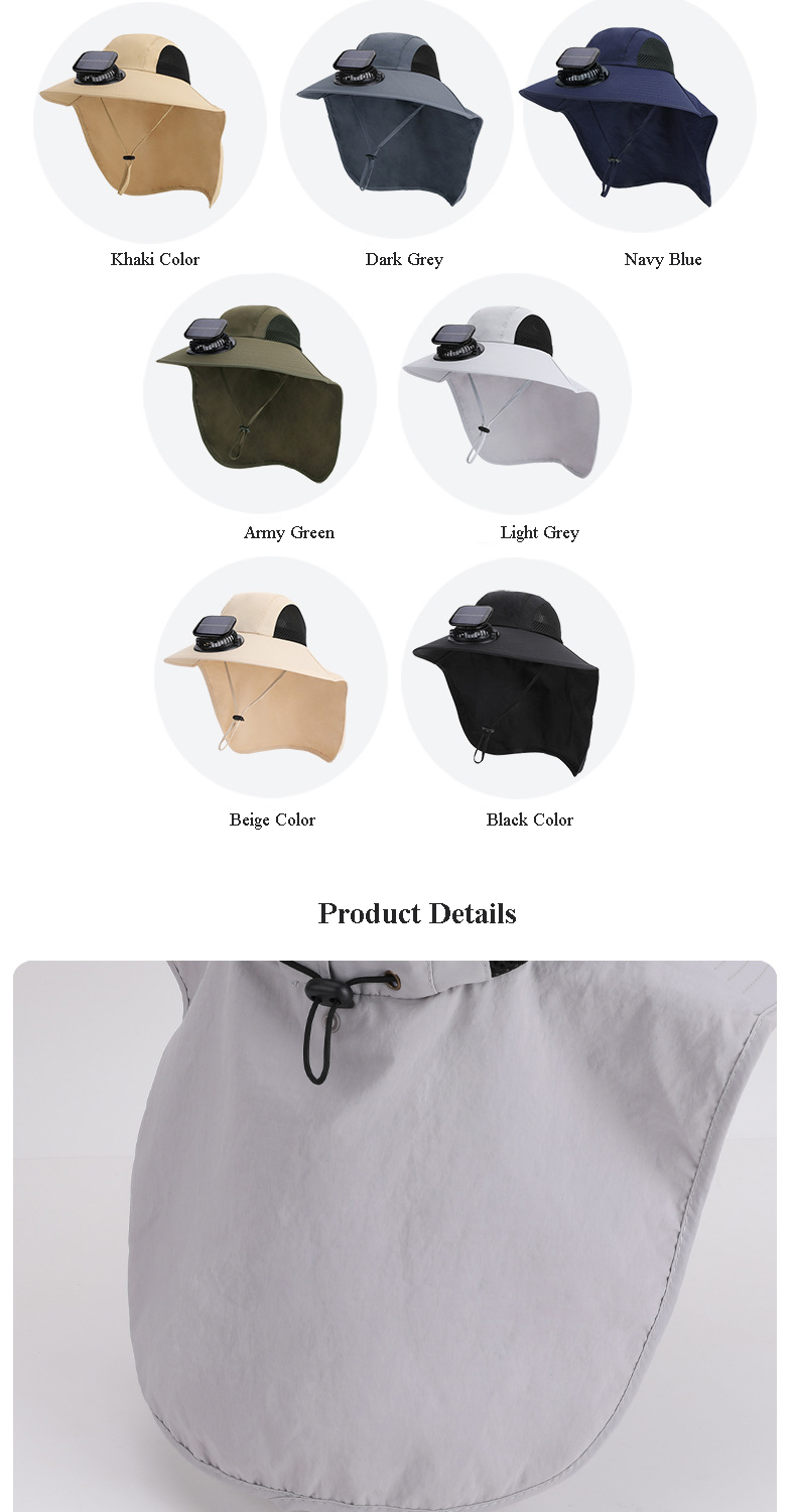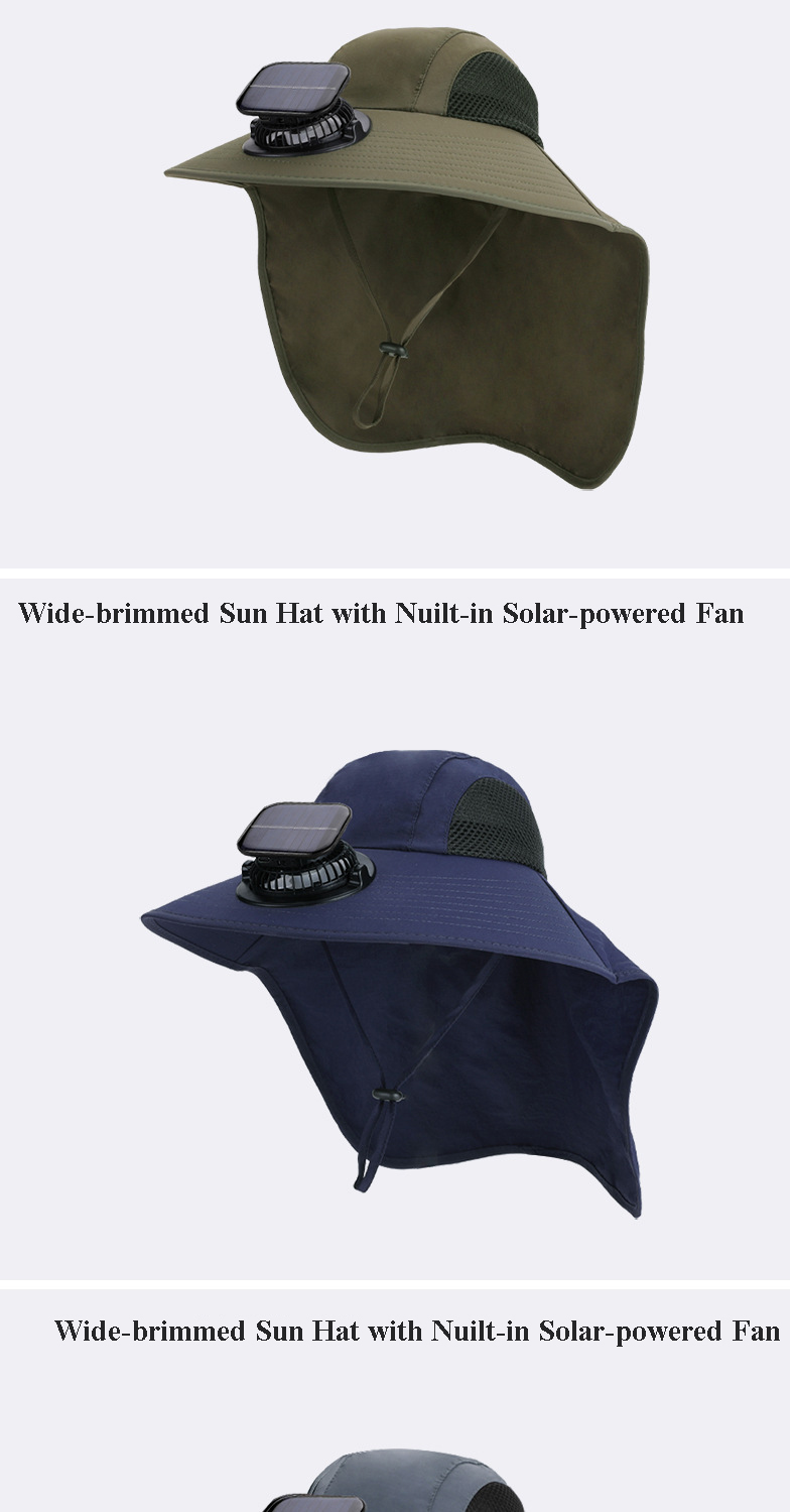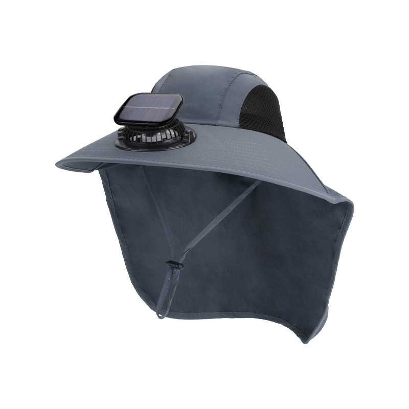 Wide Brim Hat with Dual Power Options – Equipped with a built-in 800mAh rechargeable battery and supports both solar and USB charging. The solar panel charges automatically under sunlight, providing eco-friendly and worry-free cooling on the go.