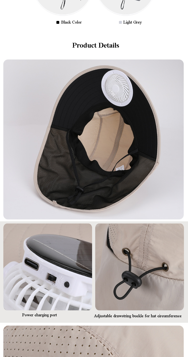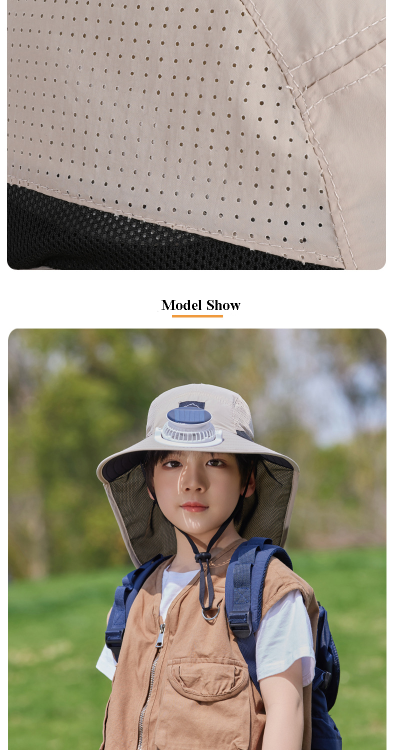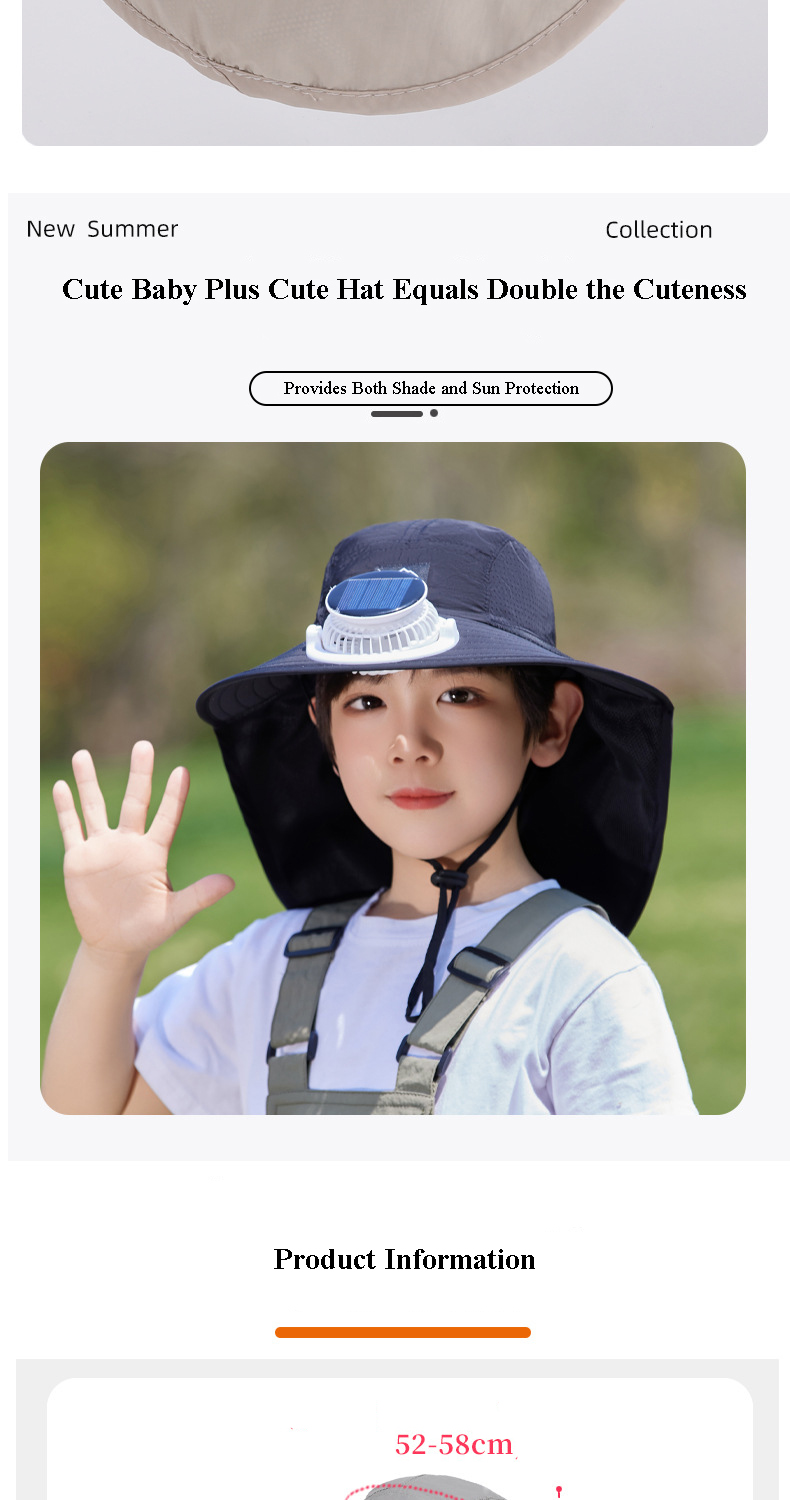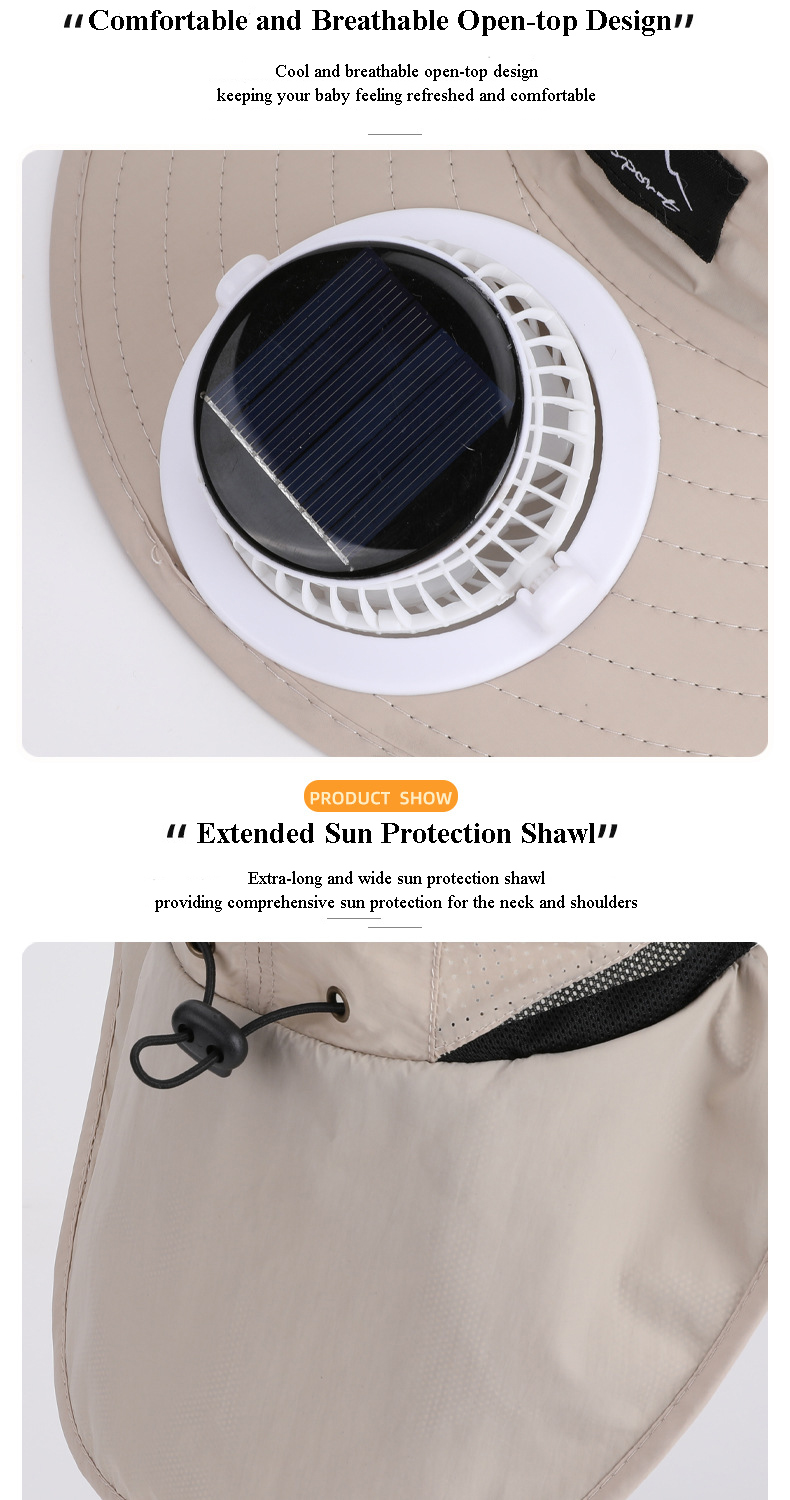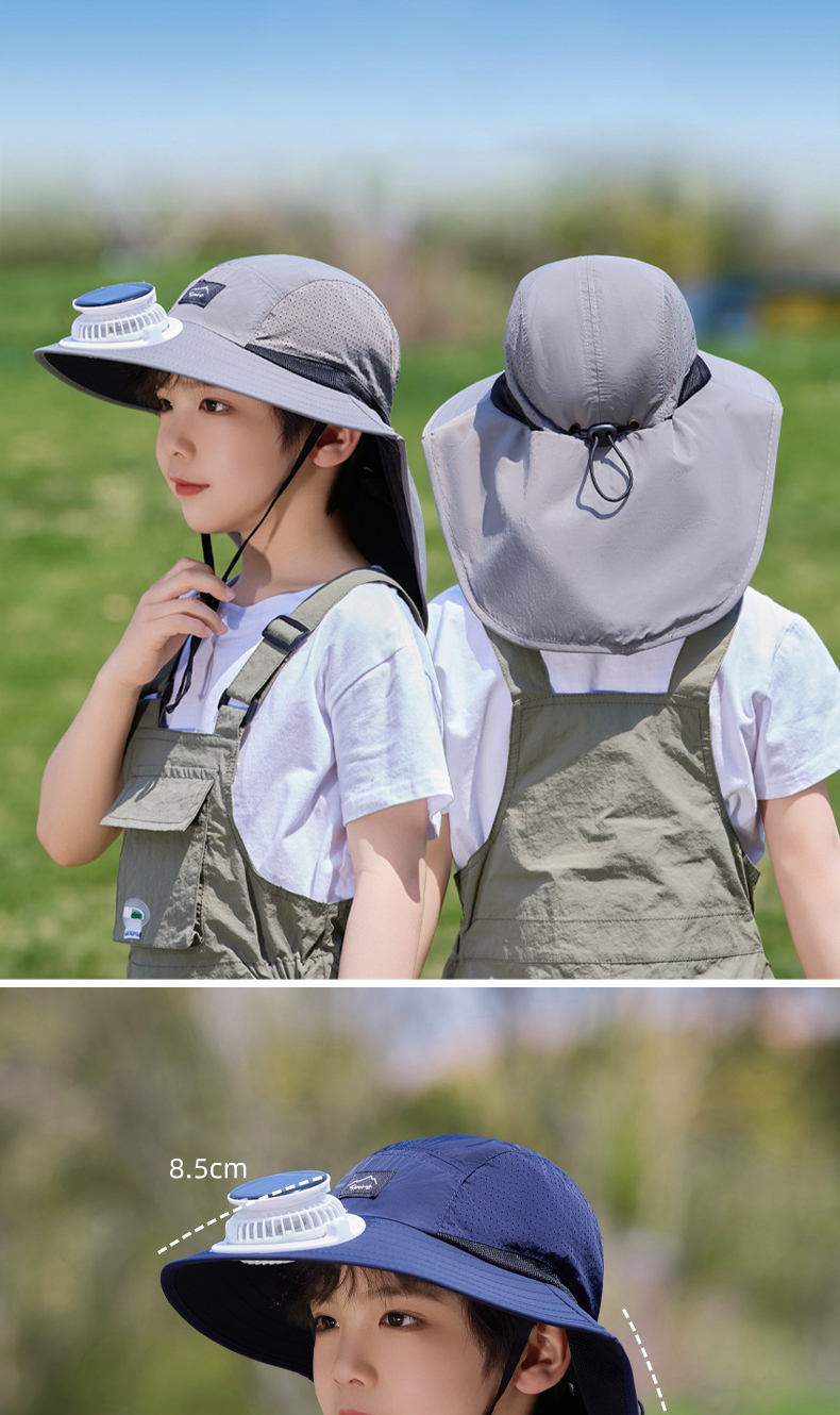 Built-in Solar Fan & Rechargeable:The unique solar fan hat technology powers the airflow around the head, allowing children to no longer have sweaty hair to complain about!The detachable energy-saving solar panel powers the quiet fan (no battery required!)It also supports USB charging and can be used on cloudy days.