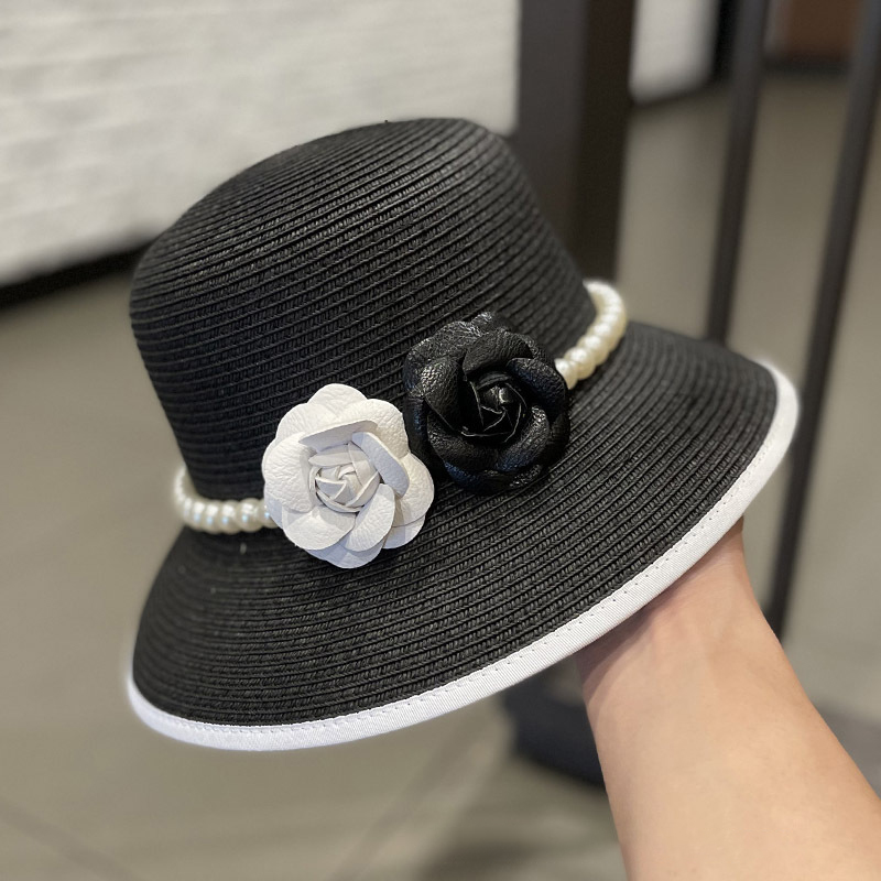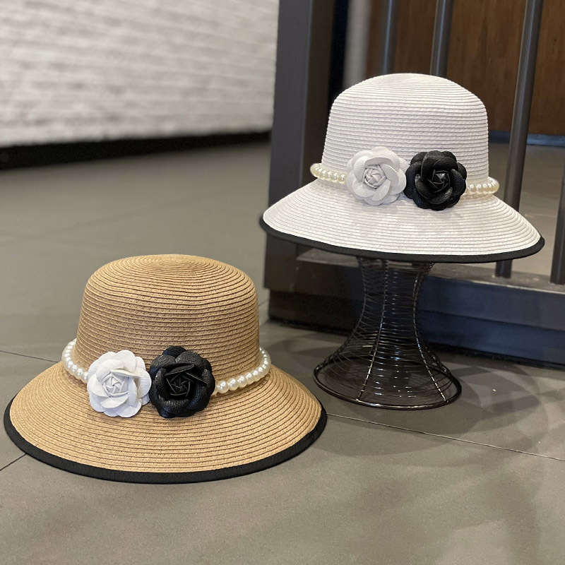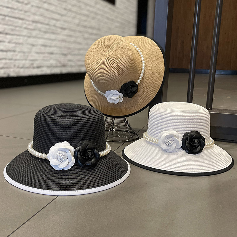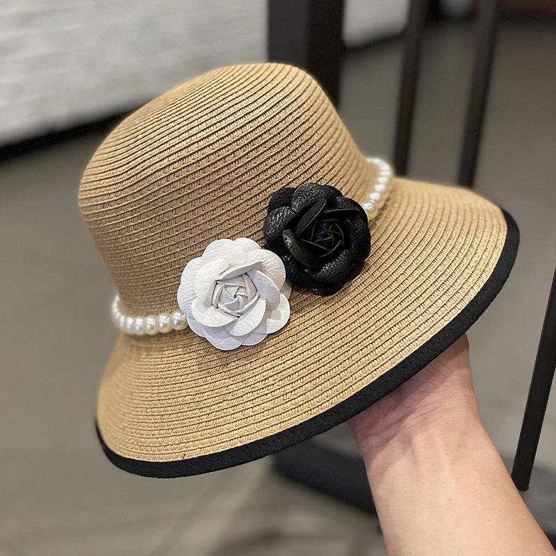 Women's round-top straw hat, summer outdoor sun hat, sun protection, face covering, fisherman hat, pearl flower basin hat, straw woven cool hat