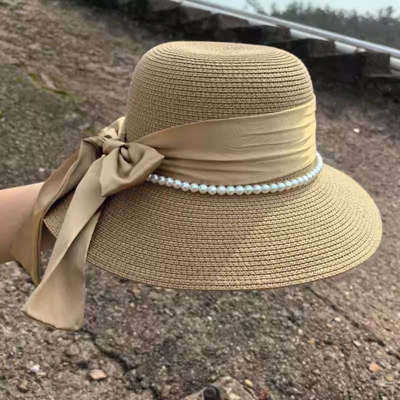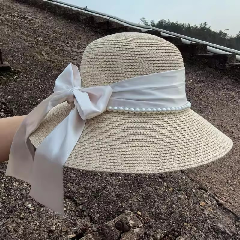 Summer Hepburn-style bow-tie beach straw hat for women, sun protection, versatile fisherman's hat, perfect for outings and UV protection.