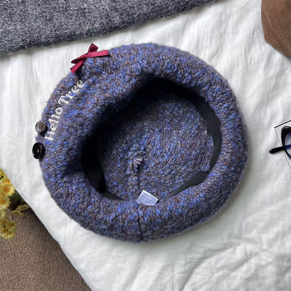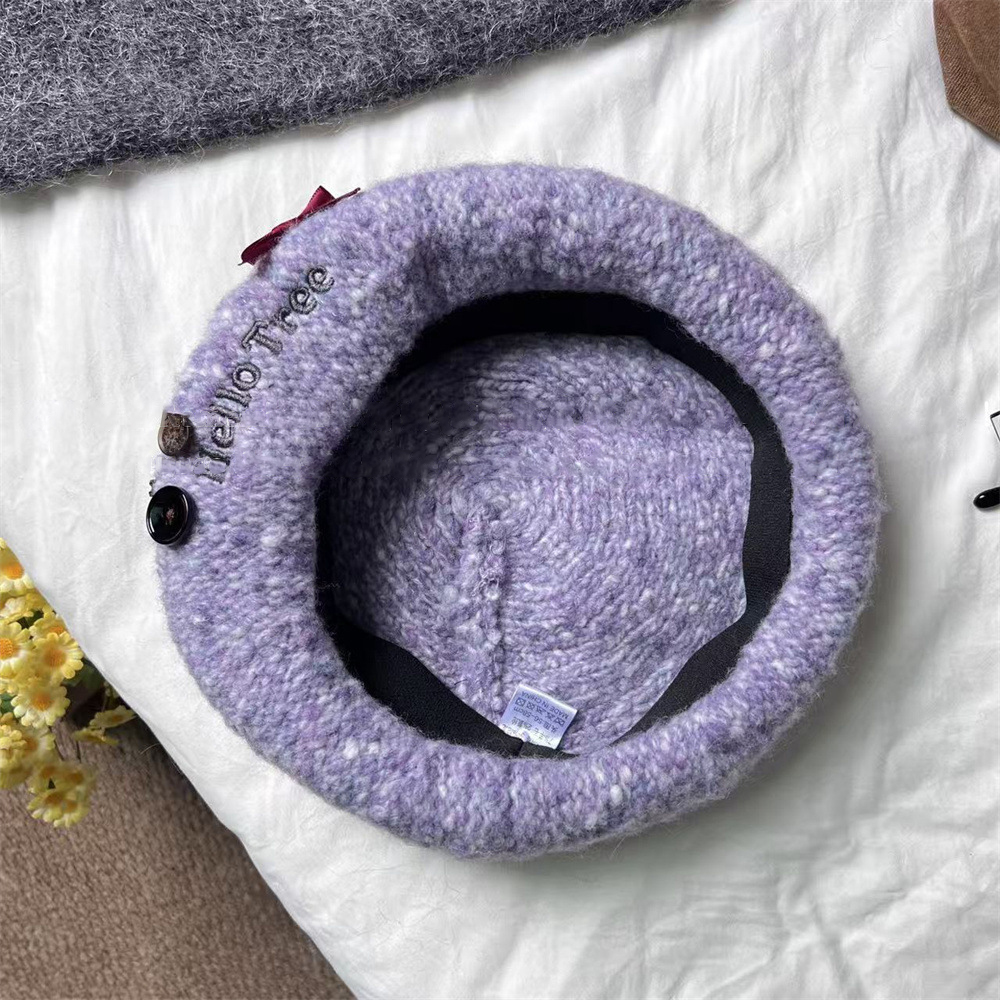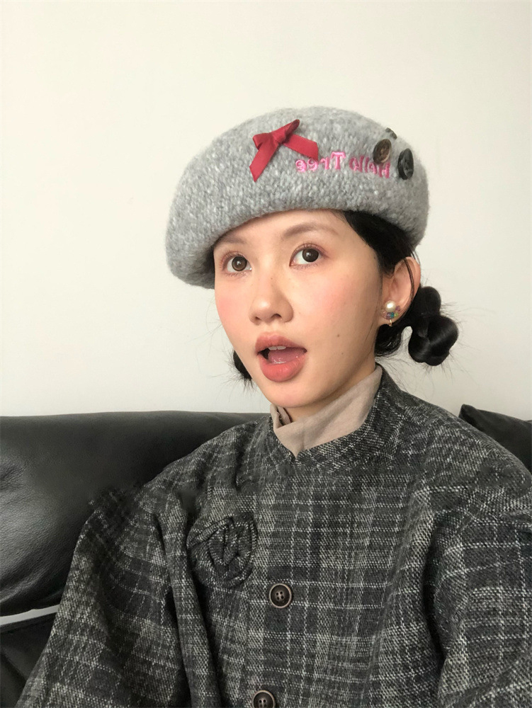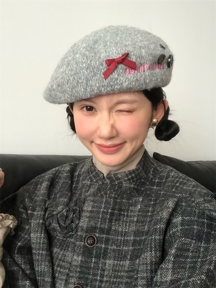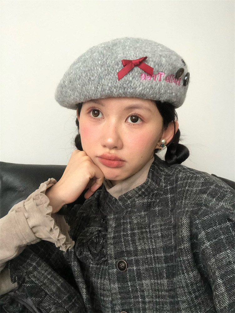 Sweet and versatile lambskin beret hat for women, perfect for autumn and winter. Casual style with a bow detail, a fashionable and warm painter's hat.