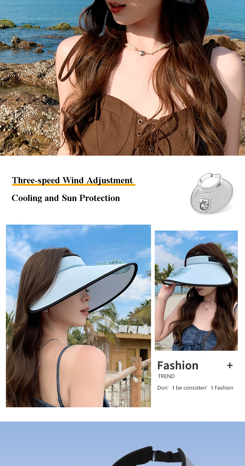 Wind Speed Three-Step adjustment : fan visor hat built-in 300mAh three-step electric fan. After fully charged, it can work continuously for 2 hours at the highest gear. The power light will flash when charging, and will stay on when fully charged