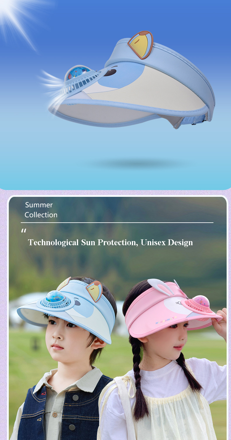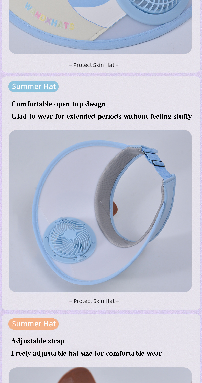 USB Sun Visor Hat:It differs from other visors with fan in that it has three speeds and can work continuously for 3-4 hours on the lowest speed, which is perfectly suited to travel needs and is rechargeable.