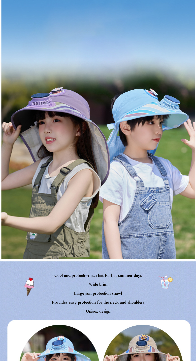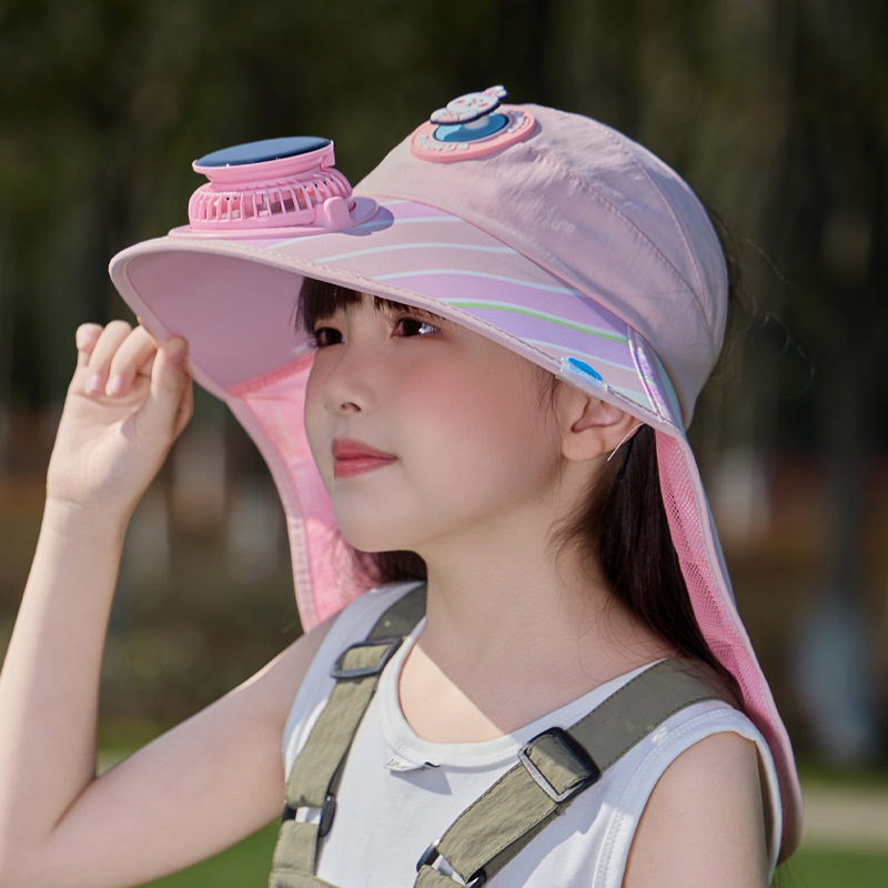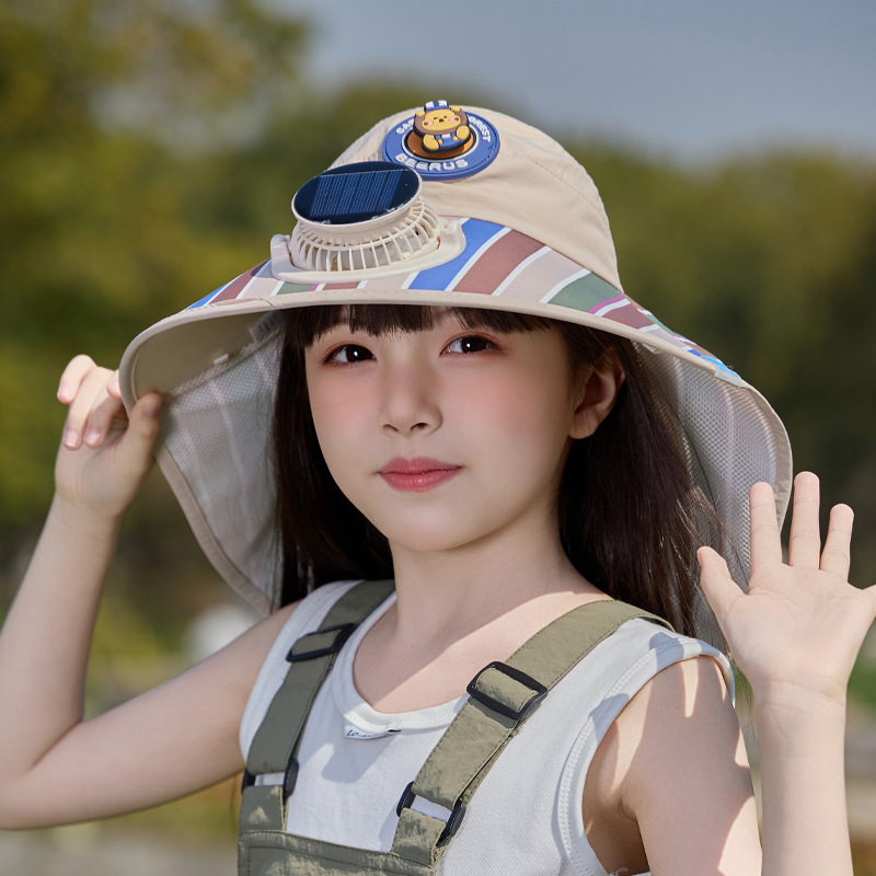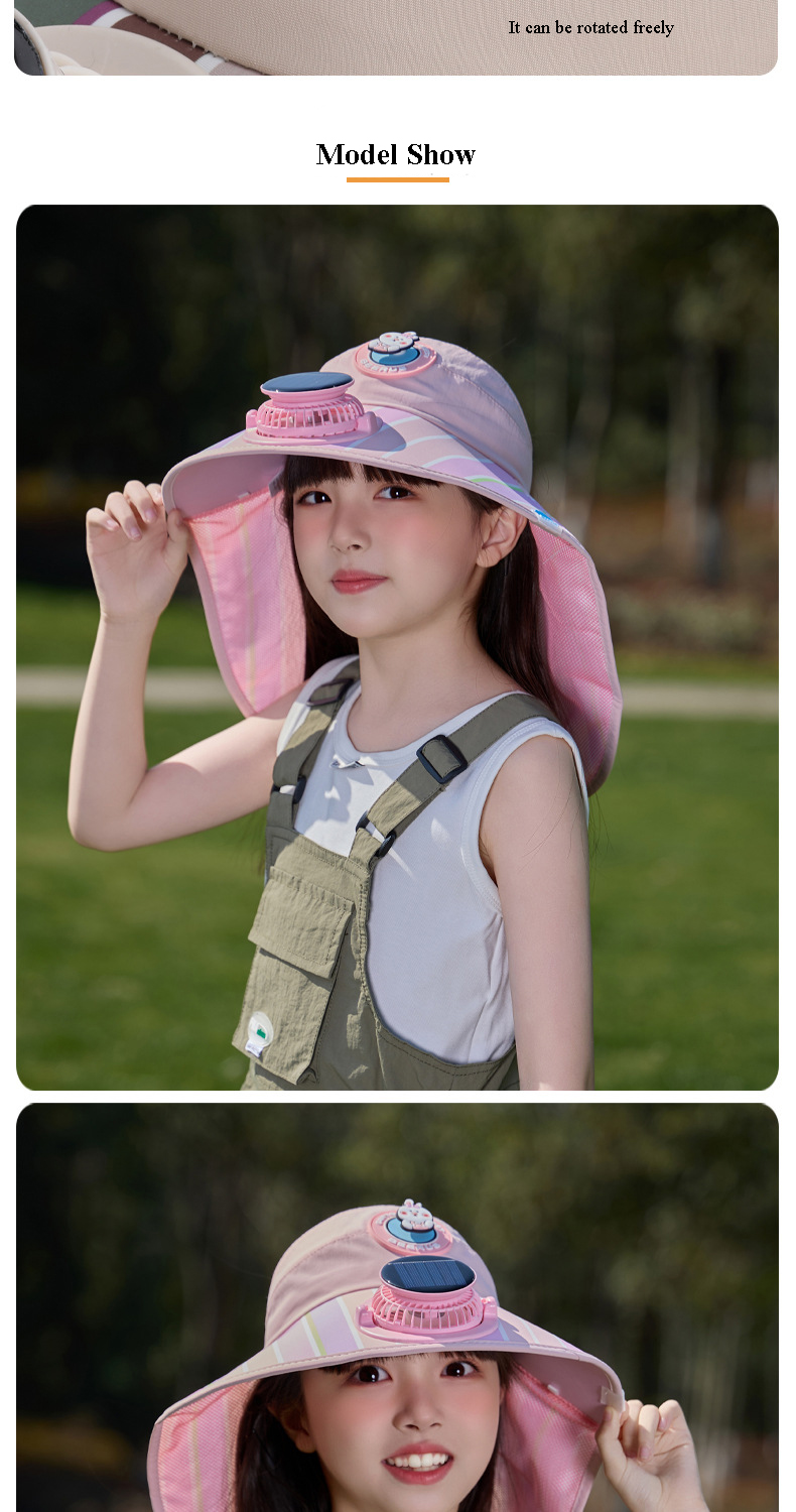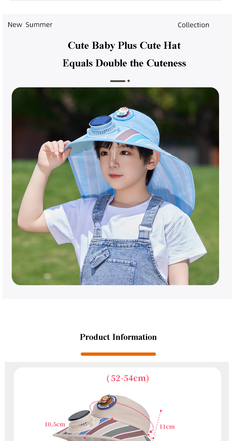Built-in Solar Fan & Rechargeable:The unique solar fan hat technology powers the airflow around the head, allowing children to no longer have sweaty hair to complain about!The detachable energy-saving solar panel powers the quiet fan (no battery required!)It also supports USB charging and can be used on cloudy days.