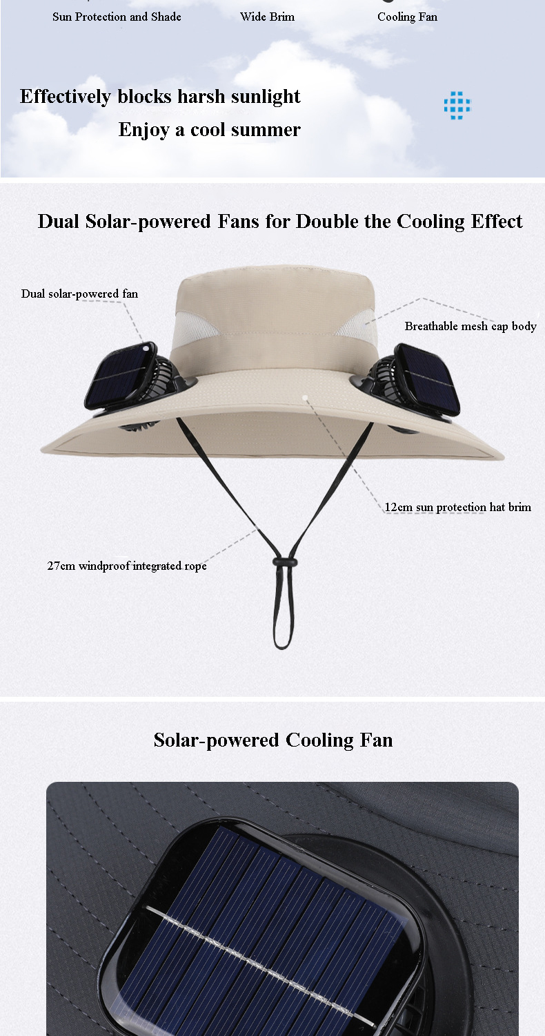 【Sun-proof】: Solar fan fishing hat is wide brim, 5 inches wide brim provides ample protection for your face and neck of sunshade. Large-area hat shielding combined with UPF50+ fabric, effectively blocked direct sunlight. Your face and head stay cool and comfortable while you're gardening, fishing, or just taking a leisurely stroll, without the need for constant adjustments
