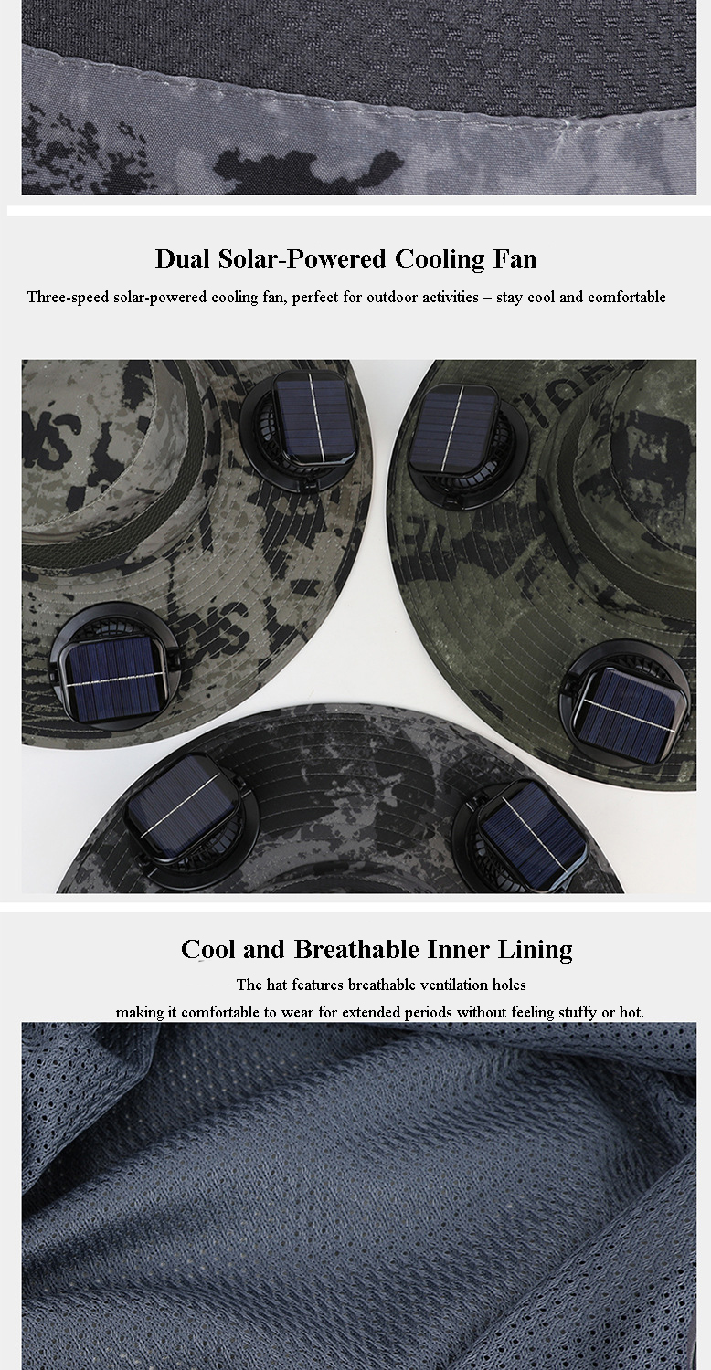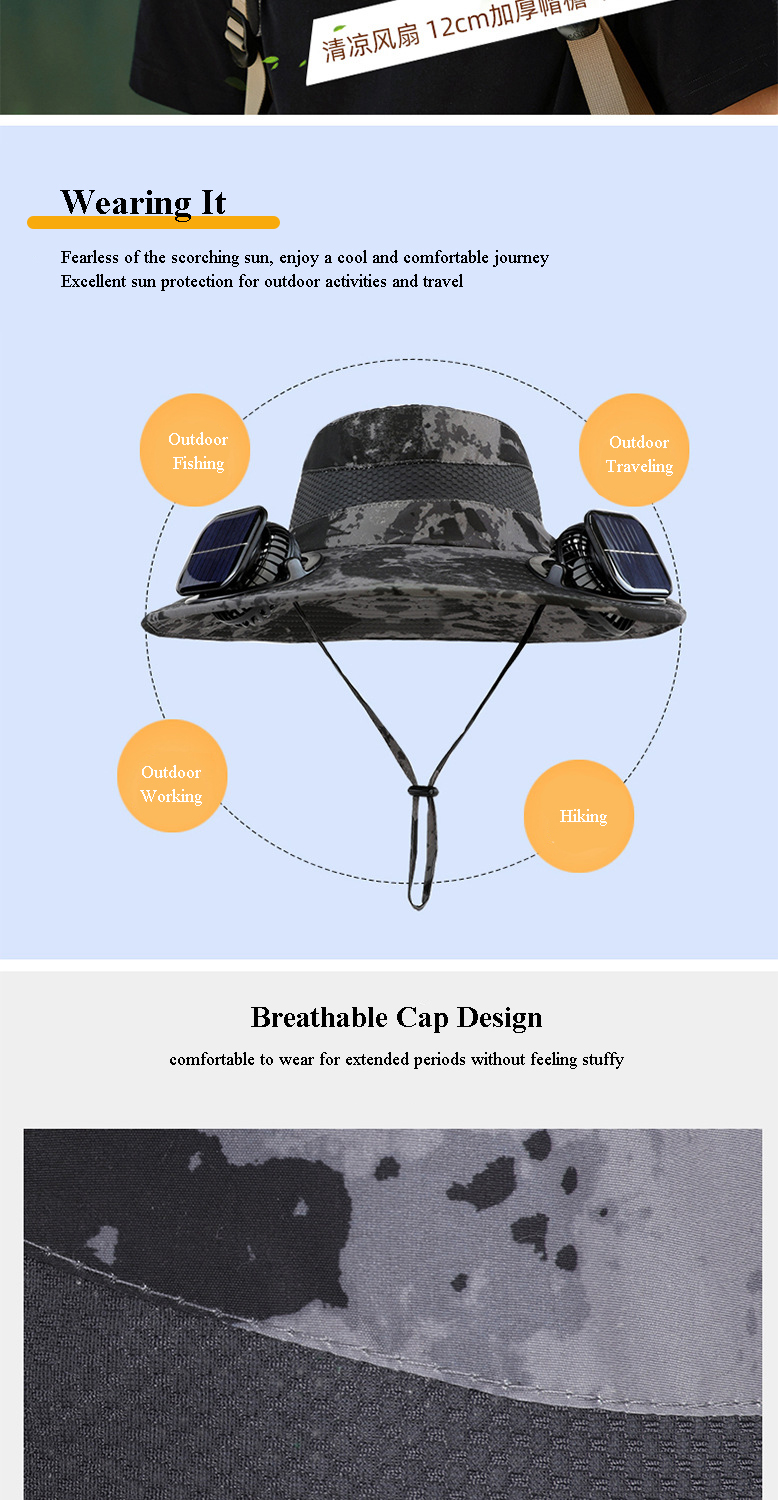 Solar energy+USB energy: Our solar fan hat adopts a dual charging mode: solar energy automatically charges when used outdoors, while the USB-C port can be used for emergency charging through a portable power bank. Never worry about the fan turning off when fishing/hiking!