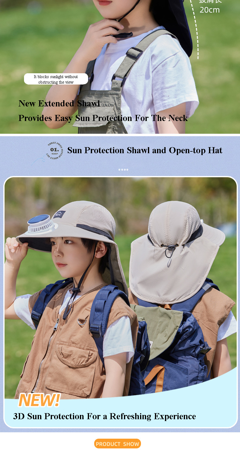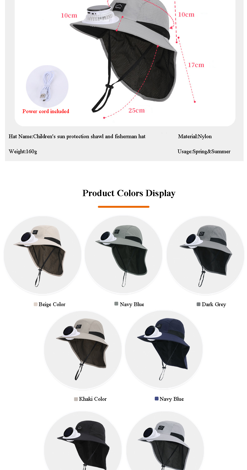 Built-in Solar Fan & Rechargeable:The unique solar fan hat technology powers the airflow around the head, allowing children to no longer have sweaty hair to complain about!The detachable energy-saving solar panel powers the quiet fan (no battery required!)It also supports USB charging and can be used on cloudy days.