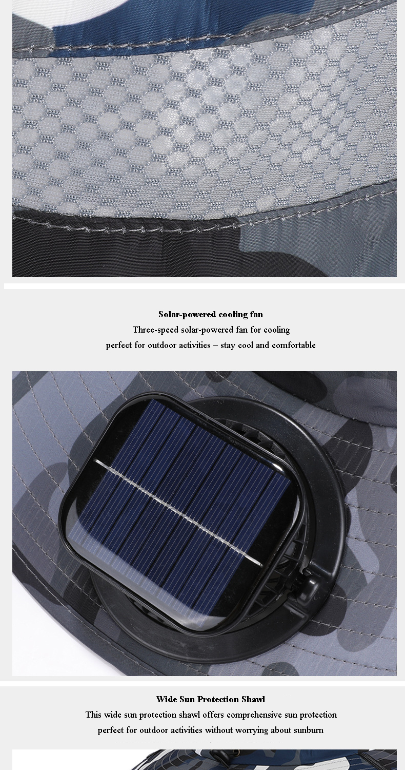 SOLAR FAN OUTDOOR HAT: Our solar-powered hat has two high-speed fans with seven adjustable blades each, rotating 180 degrees for optimal airflow. Ideal for outdoor activities like hiking and fishing, it keeps you cool using solar energy, combining functionality with eco-friendliness.