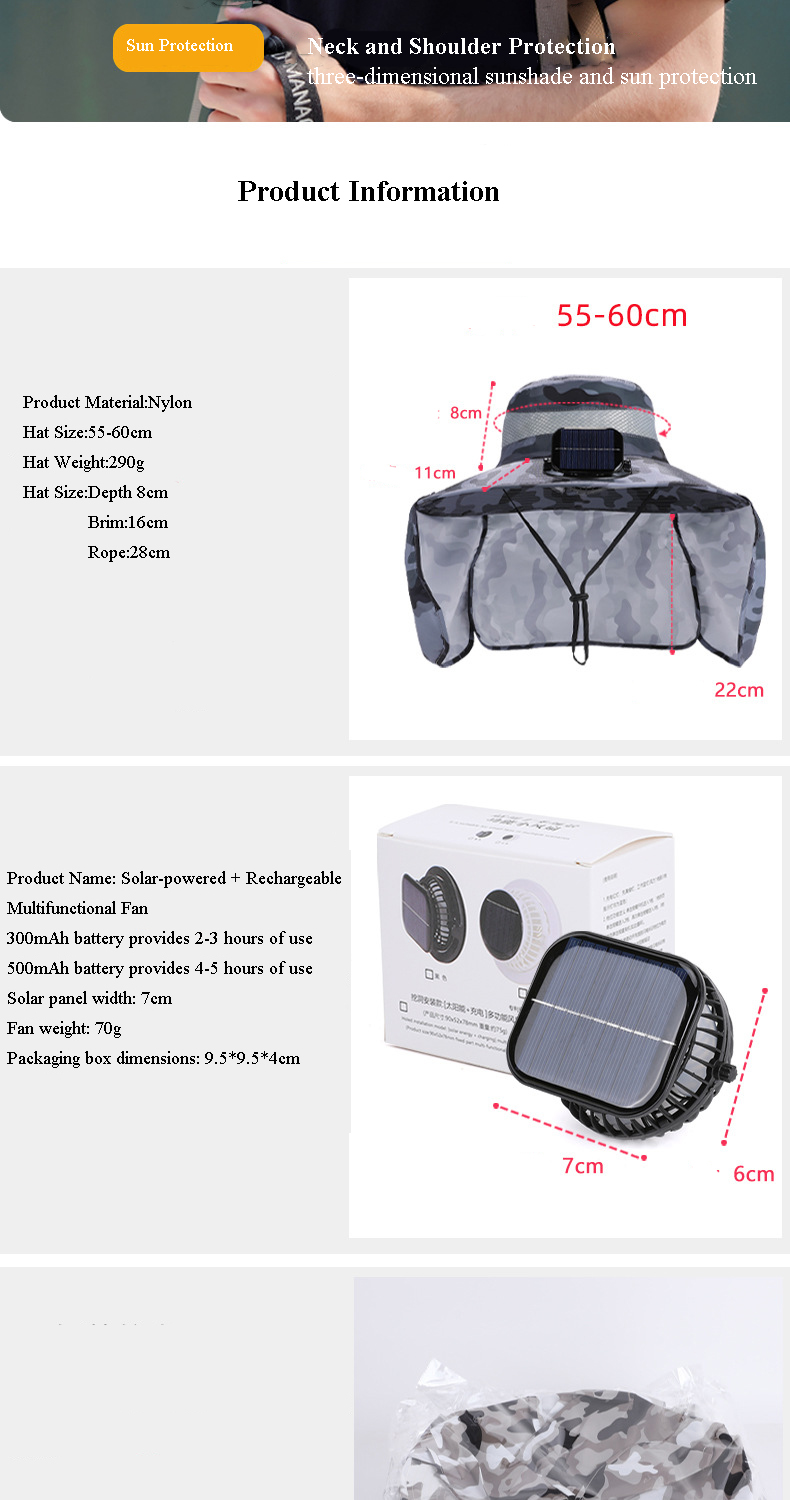 ADJUSTABLE HAT CIRCUMFERENCE: Our fan hat features an adjustable drawstring for the perfect fit. With a simple push and pull, you can easily adjust the circumference from 22 inches to 23.6 inches. The solar fan hats depth is 6 inches, and it's lightweight for easy portability.